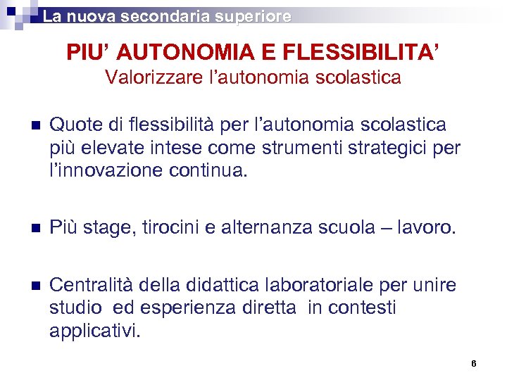 1 2 3 4 5 STRUTTURA DEL PERCORSO QUINQUENNALE LICEI 1+1 ISTITUTI TECNICI ISTITUTI PROFESSIONALI 1+1 5 Il percorso è articolato in: 2 bienni e 1 quinto anno 5