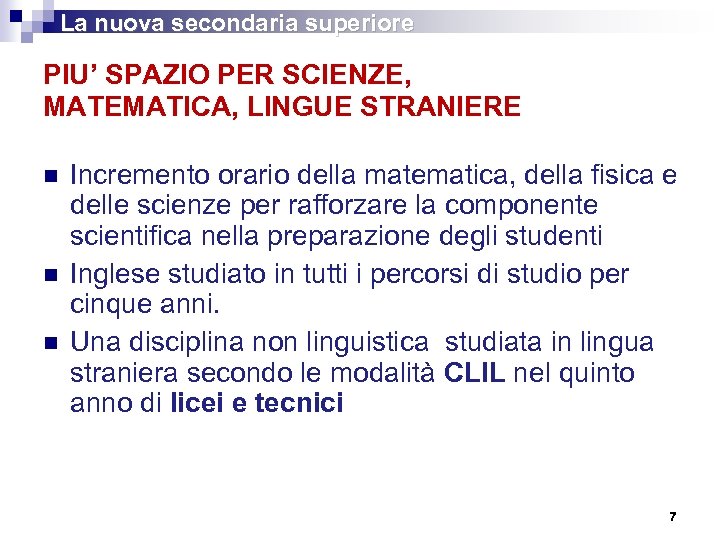 La nuova secondaria superiore PIU’ AUTONOMIA E FLESSIBILITA’ Valorizzare l’autonomia scolastica Quote di flessibilità per l’autonomia scolastica più elevate intese come strumenti strategici per l’innovazione continua. Più stage, tirocini e alternanza scuola – lavoro. Centralità della didattica laboratoriale per unire studio ed esperienza diretta in contesti applicativi. 6