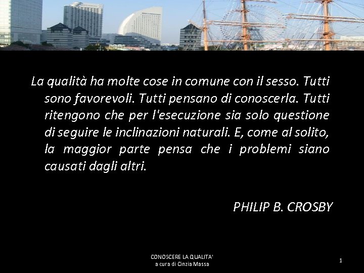La qualità ha molte cose in comune con il sesso. Tutti sono favorevoli. Tutti pensano di conoscerla. Tutti ritengono che per l'esecuzione sia solo questione di seguire le inclinazioni naturali. E, come al solito, la maggior parte pensa che i problemi siano causati dagli altri. PHILIP B. CROSBY CONOSCERE LA QUALITA' a cura di Cinzia Massa 1