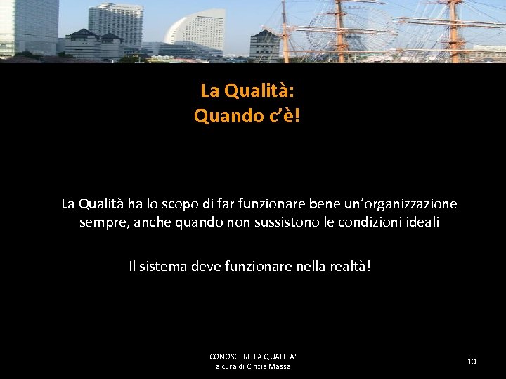 Quando NON c’è la qualità Cosa succede quando cambia personale in una struttura? Bisogna spiegare ogni volta: Com’è fatta l’organizzazione chi sono le persone che ha vicino o con le quali deve interagire cosa fanno le persone che ha vicino o con le quali deve interagire quali sono le attività delle altre organizzazioni con cui si hanno contatti • dove si trovano “le carte” • • • CONOSCERE LA QUALITA' a cura di Cinzia Massa 9