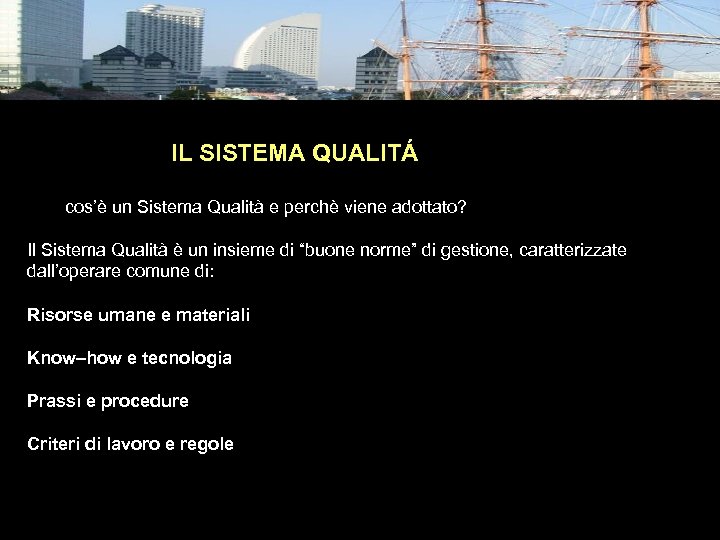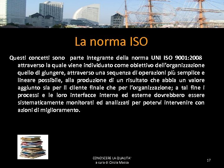 IL SISTEMA QUALITÁ Che cos’è un Sistema Qualità e perchè viene adottato? Il Sistema Qualità è un insieme di “buone norme” di gestione, caratterizzate dall’operare comune di: Risorse umane e materiali Know–how e tecnologia Prassi e procedure Criteri di lavoro e regole Massa Cinzia