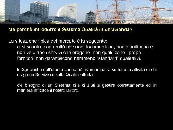 Ma perchè introdurre il Sistema Qualità in un’azienda? La situazione tipica del mercato è la seguente: ci si scontra con realtà che non documentano, non pianificano e non valutano i servizi che erogano, non qualificano i propri fornitori, non garantiscono nemmeno “standard” qualitativi. le Specifiche dell’utente vanno ad avere impatto su tutte le attività di chi eroga un Servizio e sulla Qualità offerta c’è bisogno di un Sistema che ci aiuti a gestire correttamente ed in maniera efficace il nostro lavoro. Massa Cinzia