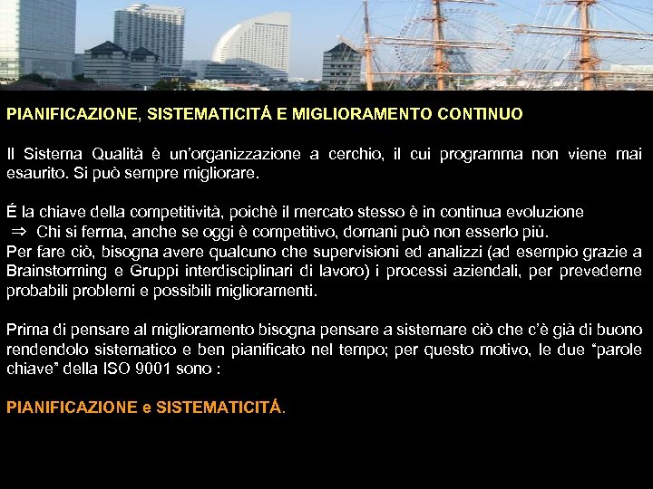 PIANIFICAZIONE, SISTEMATICITÁ E MIGLIORAMENTO CONTINUO Il Sistema Qualità è un’organizzazione a cerchio, il cui programma non viene mai esaurito. Si può sempre migliorare. É la chiave della competitività, poichè il mercato stesso è in continua evoluzione ⇒ Chi si ferma, anche se oggi è competitivo, domani può non esserlo più. Per fare ciò, bisogna avere qualcuno che supervisioni ed analizzi (ad esempio grazie a Brainstorming e Gruppi interdisciplinari di lavoro) i processi aziendali, per prevederne probabili problemi e possibili miglioramenti. Prima di pensare al miglioramento bisogna pensare a sistemare ciò che c’è già di buono rendendolo sistematico e ben pianificato nel tempo; per questo motivo, le due “parole chiave” della ISO 9001 sono : PIANIFICAZIONE e SISTEMATICITÁ. Massa Cinzia