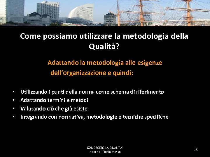La norma ISO Questi concetti sono parte integrante della norma UNI ISO 9001: 2008 attraverso la quale viene individuato come obiettivo dell’organizzazione quello di giungere, attraverso una sequenza di operazioni più semplice e lineare possibile, alla produzione di un risultato che abbia un valore aggiunto sia per il cliente finale che per l’organizzazione; a tal fine i processi e le loro interfacce interne ed esterne dovrebbero essere sistematicamente monitorati ed analizzati per potervi intervenire con azioni di miglioramento. CONOSCERE LA QUALITA' a cura di Cinzia Massa 17