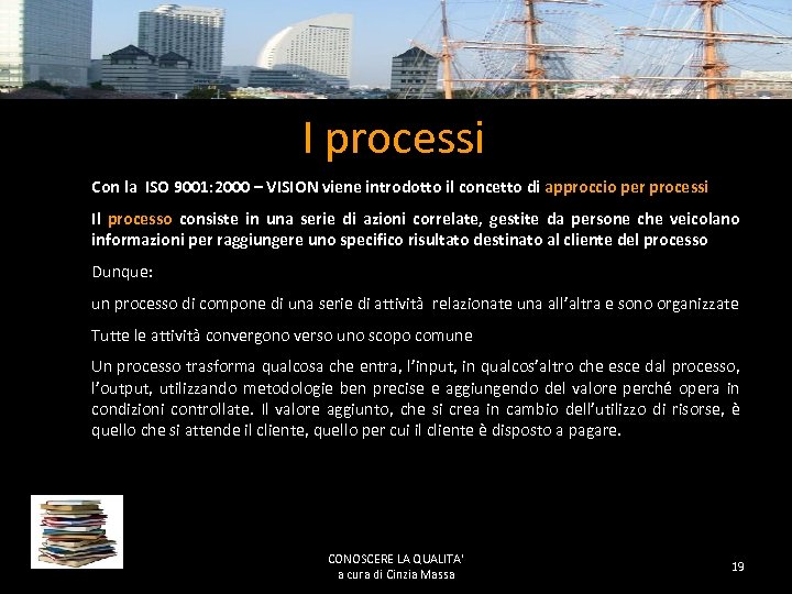 Come possiamo utilizzare la metodologia della Qualità? Adattando la metodologia alle esigenze dell’organizzazione e quindi: • • Utilizzando i punti della norma come schema di riferimento Adattando termini e metodi Valutando ciò che già esiste Integrando con normativa, metodologie e tecniche specifiche CONOSCERE LA QUALITA' a cura di Cinzia Massa 18