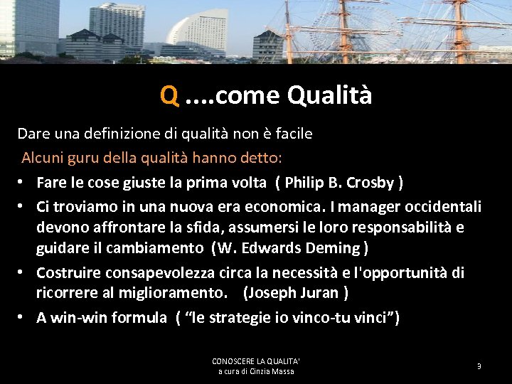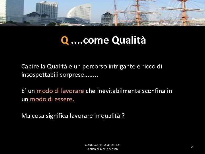 Q. . come Qualità Capire la Qualità è un percorso intrigante e ricco di insospettabili sorprese. . . . E’ un modo di lavorare che inevitabilmente sconfina in un modo di essere. Ma cosa significa lavorare in qualità ? CONOSCERE LA QUALITA' a cura di Cinzia Massa 2