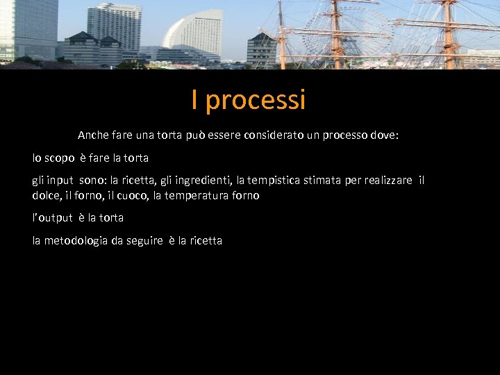 I processi Anche fare una torta può essere considerato un processo dove: lo scopo è fare la torta gli input sono: la ricetta, gli ingredienti, la tempistica stimata per realizzare il dolce, il forno, il cuoco, la temperatura forno l’output è la torta la metodologia da seguire è la ricetta Massa Cinzia