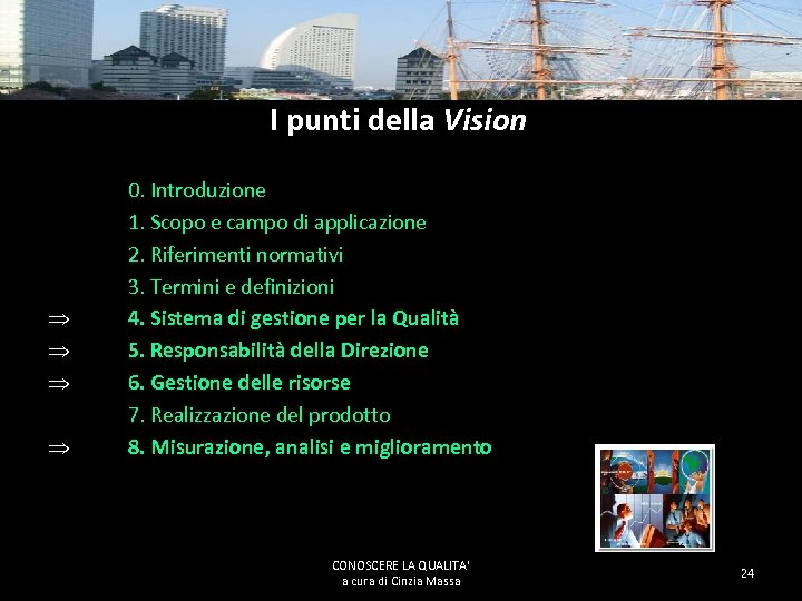 I punti della Vision Þ Þ 0. Introduzione 1. Scopo e campo di applicazione 2. Riferimenti normativi 3. Termini e definizioni 4. Sistema di gestione per la Qualità 5. Responsabilità della Direzione 6. Gestione delle risorse 7. Realizzazione del prodotto 8. Misurazione, analisi e miglioramento CONOSCERE LA QUALITA' a cura di Cinzia Massa 24