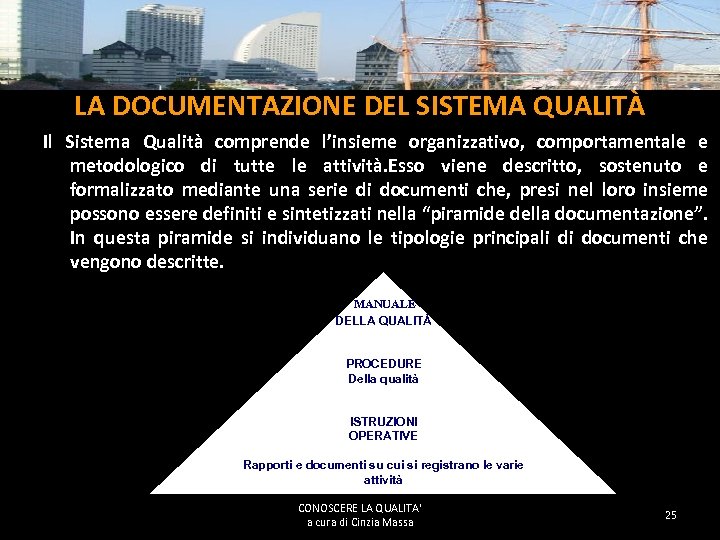 IL SISTEMA QUALITÁ É uno strumento per poter dar fiducia (confidenza) ai clienti interni ed esterni (Standard Internazionale). In una logica combinata, di sistema, appunto, affinché si possa pianificare il miglioramento, garantire affidabilità ai propri clienti e, attraverso la registrazione documentata delle attività, dare Misurabilità del proprio lavoro. Massa Cinzia