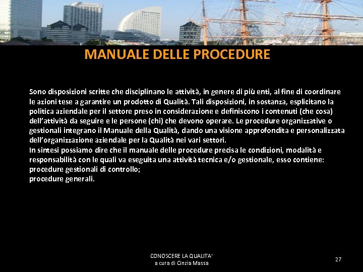 MANUALE DELLA QUALITA’ E’ il documento di base del Sistema Qualità : descrive i criteri generali organizzativi e le politiche dell’azienda rispetto alle normative di Qualità applicabili per i vari settori di attività. Esso contiene: • Politiche per la qualità; • Obiettivi ed organizzazione aziendale; • Prescrizioni e descrizioni del sistema qualità (SQ). • Il manuale della qualità definisce l’organizzazione, le responsabilità e i principi operativi essenziali di ogni attività rilevante ai fini della qualità, rinviando, se necessario, a procedure specifiche ed istruzioni operative o ad altri documenti interni all’azienda. • Il manuale della qualità serve come riferimento per: esecuzione di ogni attività; verifica della corretta applicazione delle procedure; addestramento del personale CONOSCERE LA QUALITA' a cura di Cinzia Massa 26