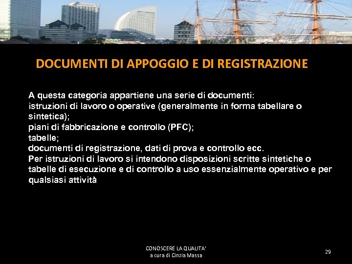 MANUALE DELLE ISTRUZIONI OPERATIVE Sono chiamate in molti modi; ad esempio pratiche standard, pratiche operative standard, procedure tecniche, POS (Standard operative procedure) ecc. Sono delle disposizioni scritte che specificano e /o descrivono le modalità (come) di esecuzione di un’attività ben determinata. In tali disposizioni vengono indicati anche i metodi, le apparecchiature, i materiali e la sequenza delle operazioni da adottare. Il manuale delle istruzioni operative considera quindi, il carattere tecnico del sistema qualità (SQ) e contiene: istruzioni di lavoro; documentazione di prodotto; normative. CONOSCERE LA QUALITA' a cura di Cinzia Massa 28