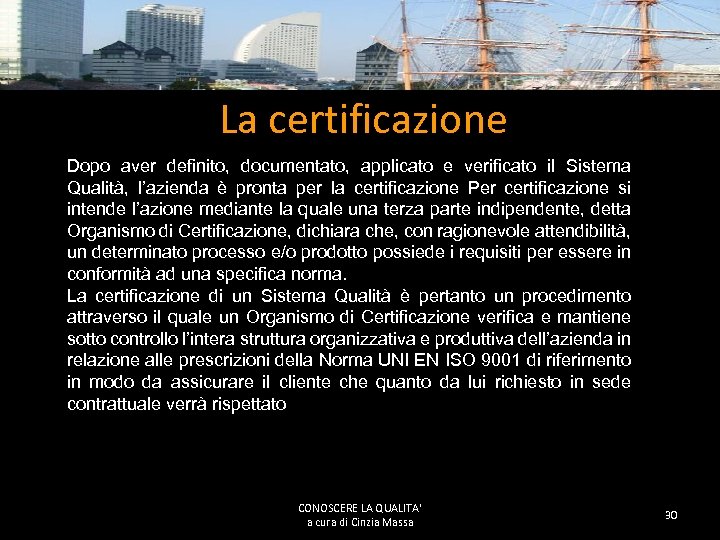 La certificazione Dopo aver definito, documentato, applicato e verificato il Sistema Qualità, l’azienda è pronta per la certificazione Per certificazione si intende l’azione mediante la quale una terza parte indipendente, detta Organismo di Certificazione, dichiara che, con ragionevole attendibilità, un determinato processo e/o prodotto possiede i requisiti per essere in conformità ad una specifica norma. La certificazione di un Sistema Qualità è pertanto un procedimento attraverso il quale un Organismo di Certificazione verifica e mantiene sotto controllo l’intera struttura organizzativa e produttiva dell’azienda in relazione alle prescrizioni della Norma UNI EN ISO 9001 di riferimento in modo da assicurare il cliente che quanto da lui richiesto in sede contrattuale verrà rispettato CONOSCERE LA QUALITA' a cura di Cinzia Massa 30