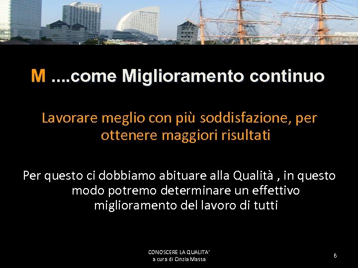 M. . come Miglioramento continuo Lavorare meglio con più soddisfazione, per ottenere maggiori risultati Per questo ci dobbiamo abituare alla Qualità , in questo modo potremo determinare un effettivo miglioramento del lavoro di tutti CONOSCERE LA QUALITA' a cura di Cinzia Massa 6