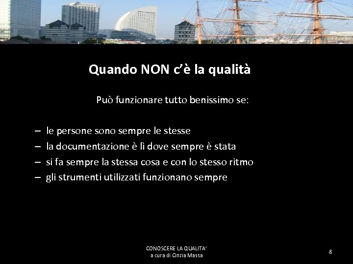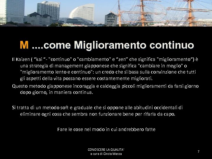 M. . come Miglioramento continuo Il Kaizen ( “kai “- "continuo" o "cambiamento" e “zen” che significa "miglioramento“) è una strategia di management giapponese che significa "cambiare in meglio" o "miglioramento lento e continuo": un credo che si basa sulla convinzione che tutti gli aspetti della vita possano essere costantemente migliorati. Questo metodo giapponese incoraggia e caldeggia piccoli miglioramenti da farsi giorno dopo giorno, in maniera continua. Si tratta di un metodo soft e graduale che si oppone alle abitudini occidentali di eliminare ogni cosa che sembra non funzionare bene per rifarla da capo. Fare le cose nel modo in cui andrebbero fatte CONOSCERE LA QUALITA' a cura di Cinzia Massa 7