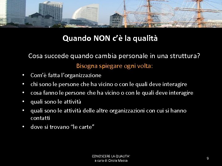 Quando NON c’è la qualità Può funzionare tutto benissimo se: – – le persone sono sempre le stesse la documentazione è lì dove sempre è stata si fa sempre la stessa cosa e con lo stesso ritmo gli strumenti utilizzati funzionano sempre CONOSCERE LA QUALITA' a cura di Cinzia Massa 8