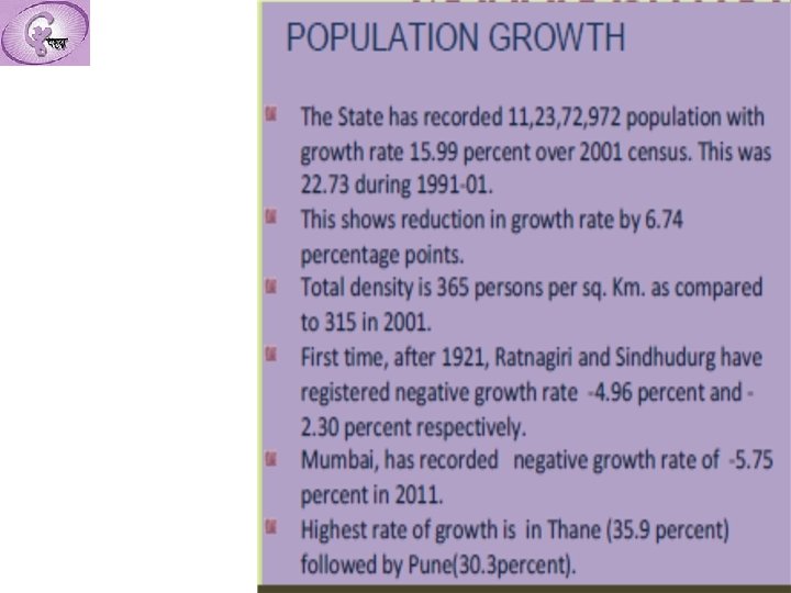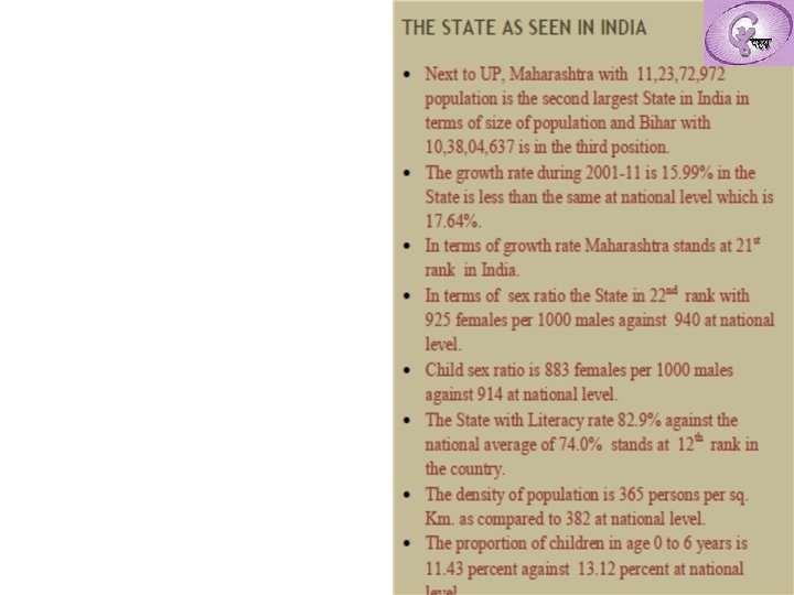 Mumbai Metropolitan Region • Area : 3390 sq. km. (1% of state area) • Population : 2. 30 crore (54% of urban & 24% of state population) • Per Capita income : Rs. 85000 (54867 - State Avg. ) • HDI : 0. 91 (0. 58) • G S D P proportion : 45%