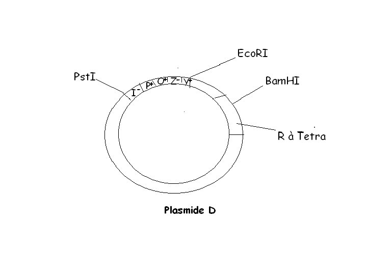 L’hypothèse la plus probable pour interpréter ces résultats est l’existence d’un site Pst. I au niveau du système Lac. Celui-ci est situé au niveau d’une région qui ne perturbe pas la fonction de l’opéron puisque z et y s’expriment. Il en ressort que ce site est situé au niveau du gène régulateur i, ce dernier est donc de toute manière muté i-, l’action de Pst. I à ce niveau reste sans conséquence sur l’expression. Par contre l’existence de ce site Pst. I sur i, avec le site Pst. I appartenant au vecteur a supprimé un fragment du gène de résistance à l’ampicilline ce qui a provoqué la sensibilité à cette dernière au niveau de la souche D.