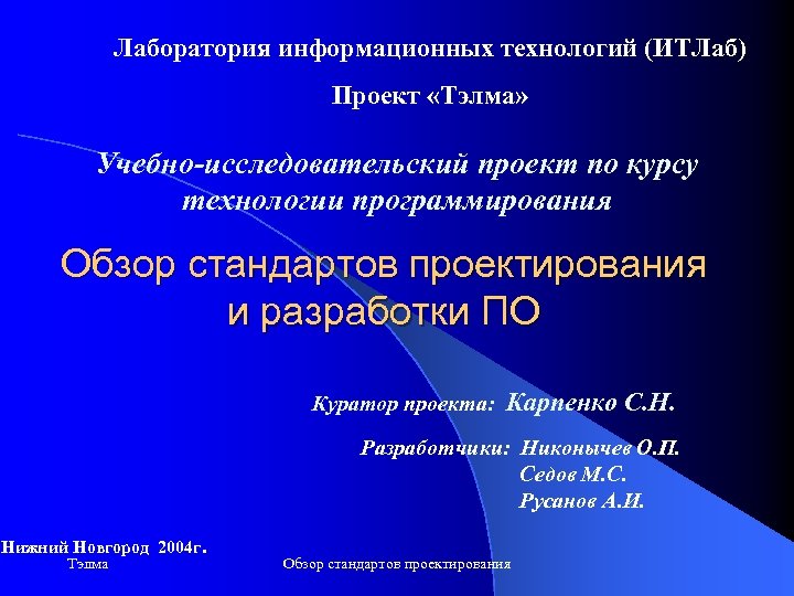Лаборатория информационных технологий (ИТЛаб) Проект «Тэлма» Учебно-исследовательский проект по курсу технологии программирования Обзор стандартов проектирования и разработки ПО Куратор проекта: Карпенко С. Н. Разработчики: Никонычев О. П. Седов М. С. Русанов А. И. Нижний Новгород 2004 г. Тэлма Обзор стандартов проектирования