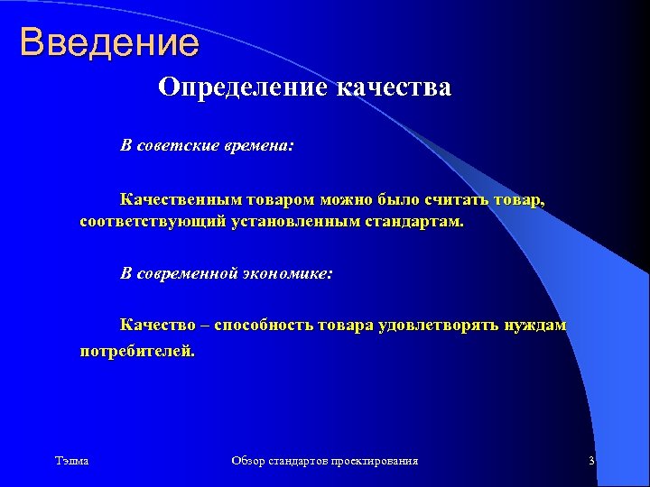 Введение Определение качества В советские времена: Качественным товаром можно было считать товар, соответствующий установленным стандартам. В современной экономике: Качество – способность товара удовлетворять нуждам потребителей. Тэлма Обзор стандартов проектирования 3