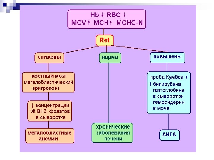 Снижение Hb MCV менее 80 fl MCH менее 26 пг MCHC менее 320 г/л RDW норма или увеличен Микроцитарные гипохромные анемии ЖДА Нарушение синтеза и утилизации порфиринов, Гетерозиг. талассемия и др. MCV в пределах нормы MCHC в пределах нормы RDW обычно в пределах нормы MCV более 100 fl MCH более 32 пг MCHC в пределах нормы RDW увеличен Нормоцитарные Нормохромные анемии Макроцитарные нормо- или гиперхромные анемии Анемии при заболеваниях почек Гипопластические анемии Острая постгеморрагическая анемия, АХЗ В 12 -дефицитная анемии Фолиеводефицитная анемия Анемия при хронических заболеваниях печени, АИГА