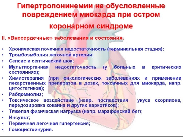 • Маркеры повреждения миокарда (тропонин T, I) при наличии признаков нестабильности или острого коронарного синдрома • NT-pro. BNP - концевой фрагмент мозгового натриуретического пептида • гомоцистеин
