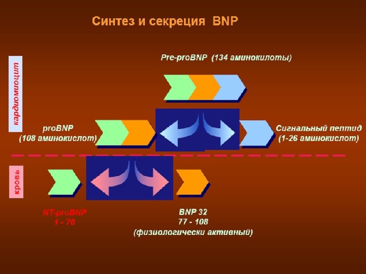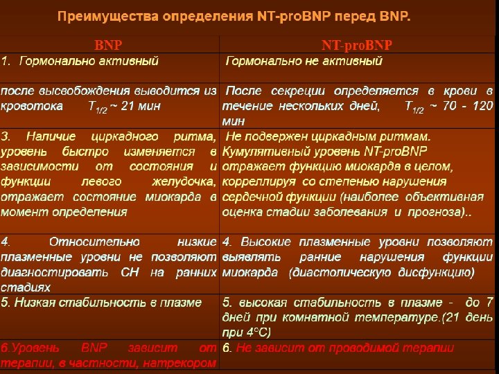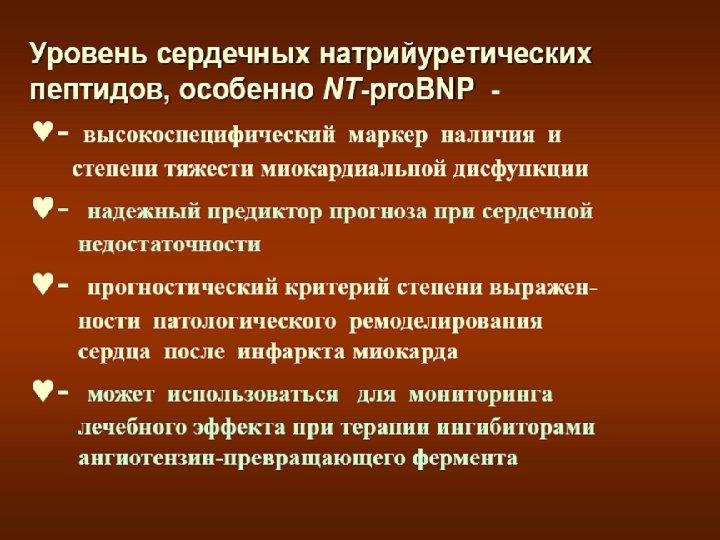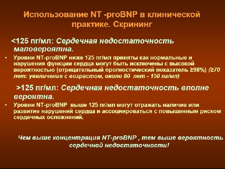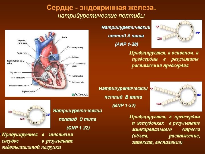 у B-натрийуретического пептида имеется ряд физиологических функций, реализуемых на сосудах, сердце и почках с целью уменьшения водной нагрузки на сердце и улучшения условий его деятельности. Натрийуретический пептид В-типа секретируется желудочками сердца из неактивного предшественника ет на растяжение и увеличения давления внутри желудо Гипертоническая болезнь, сахарный диабет, почечная недостаточность левания сердца вследствие хронической обструктивной болезни не оказывают влияния на его уровень в крови.