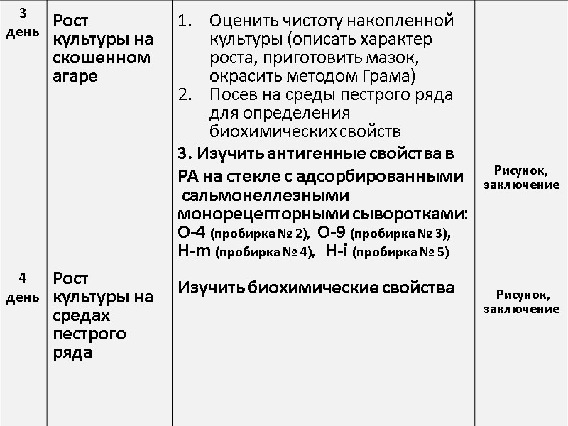 ПРИНЦИП БАКТЕРИОЛОГИЧЕСКОЙ ДИАГНОСТИКИ ИНФЕКЦИЙ, ВЫЗЫВАЕМЫХ ЭНТЕРОБАКТЕРИЯМИ Выделение чистой культуры Посев исследуемого материала на среды Эндо,Плоскирева, Левина, желчный бульон Идентификация выделенной чистой культуры Культуральные свойства Морфология (Грам- палочки) Биохимические свойства (среды Гисса) семейство род вид, серогруппа, серотип Реакция агглютинации с поливалентными и монорецепторными сыворотками