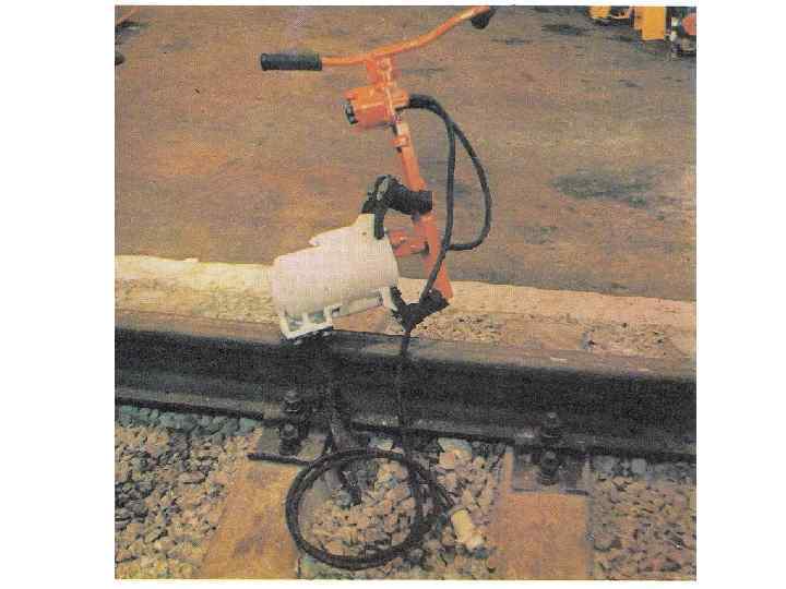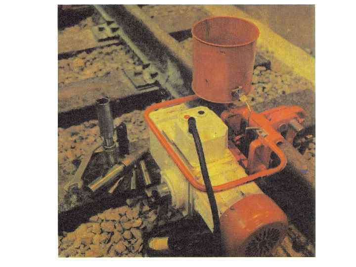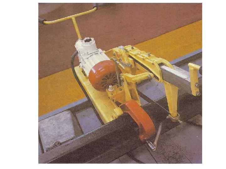 • • • Рихтовщик марки ГР-12 Б Он предназначен для перемещения пути в горизонтальном направлении вместе со шпальной решёткой. Прибор устанавливается в шпальном ящике и узкая его часть подсовывается под рельс. При перекачке масла из резервуара с помощью ручного насоса, в рабочий цилиндр шток выдвигается и принудительно заглубляет самоустанавливающееся устройство в балласт с небольшим подъемом РШР. При дальнейшем давлении шток выдвигается упирается в рельс и перемещает РШР в поперечном направлении. Масса прибора -15 кг, ход штока-10 см, усилие –до 60 т. Разгонщик стыков РН-04 Он служит для разгона и регулировки стыковых зазоров. Прибор на колесах, его накатывают по одной нитке пути на стык и устанавливают точно над зазором. Опущенный на рельс прибор закрепляется за головки смежных рельсов с помощью клиньев. Масло из резервуара в цилиндр перекачивается в ручную. Распорное усилие передается через корпус на один рельс зазор в стыке начинает увеличиваться. После операции масло уходит из цилиндра резервуар и при помощи пружин шток возвращается на место. Масса прибора -60 кг, ход штока – до 15 см, создаваемое усилие -2450 т.