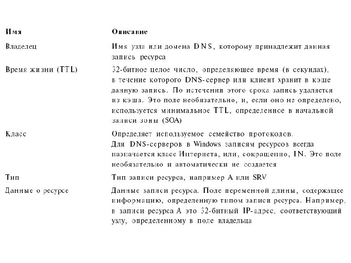 Формат записи ресурса • Формат записи ресурсов определяется контекстом, в котором он используется. Например, при просмотре и создании DNS-ответов записи ресурсов представлены в пакетах в двоичном виде. В консоли DNS записи ресурсов представлены графически, так что их легко просматривать и изменять. Однако в самом источнике — файле базы данных зоны — записи ресурсов представлены в виде текстовых записей. В действительности, при создании записей ресурсов в консоли DNS автоматически добавляются текстовые записи в соответствующий файл базы данных зоны. • В этих файлах зоны записи ресурсов имеют следующий синтаксис: • <Владелец> TTL <Класс> <Тип> <Данные о ресурсе>.