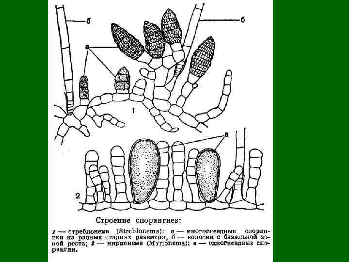 10. Бесполое размножение осуществляется зооспорами в одногнездовых спорангиях, которые располагаются как боковые выросты ветвей или многогнездовых. В спорангиях происходит редукционное деление ядра с последующими многократными митотическими делениями , образуется большое количество зооспор, которые выходят наружу через разрыв в оболочке на вершине спорангия, и недолго поплавав, прорастают в новое, такое же по морфологии, но уже гаплоидное растение.