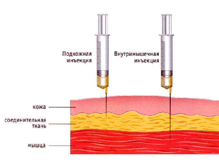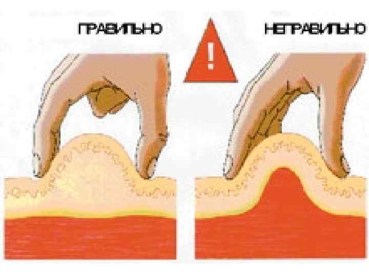 1. 2. 3. 4. 5. 6. Техника внутримышечной инъекции: Обработать место инъекции ватным тампоном со спиртом, вначале большую поверхность верхненаружного квадранта ягодицы, затем – непосредственно место инъекции; Растянуть кожу левой рукой в месте инъекции; Шприц держать перпендикулярно коже, энергичным движением ввести иглу в мышцу на глубину 4 -5 см (в зависимости от толщины подкожно-жировой клетчатки); При введении лекарства ребенку мышцу захватить пальцами левой руки, лекарство ввести в мышцу (иглу, соответственно, выбирают меньше, чем взрослому); Извлечь иглу, как при подкожной инъекции, придерживая муфту и надавливая проспиртованным ватным шариком рядом с местом инъекции; Не отнимая вату от поверхности кожи, сделать легкий массаж места инъекции.