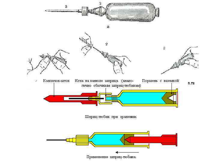 Пользование шприц-тюбиком: Шприц-тюбик предназначен для одноразового подкожного или внутримышечного введения лекарства при экстренной помощи пострадавшему. Шприц-тюбик может содержать промедол, морфин, атропин и другие сильнодействующие средства. Шприц-тюбик состоит из герметично закрытого пластикового корпуса со стерильным лекарством, инъекционной иглы, впаянной в ребристый колпачок, и защитного колпачка.