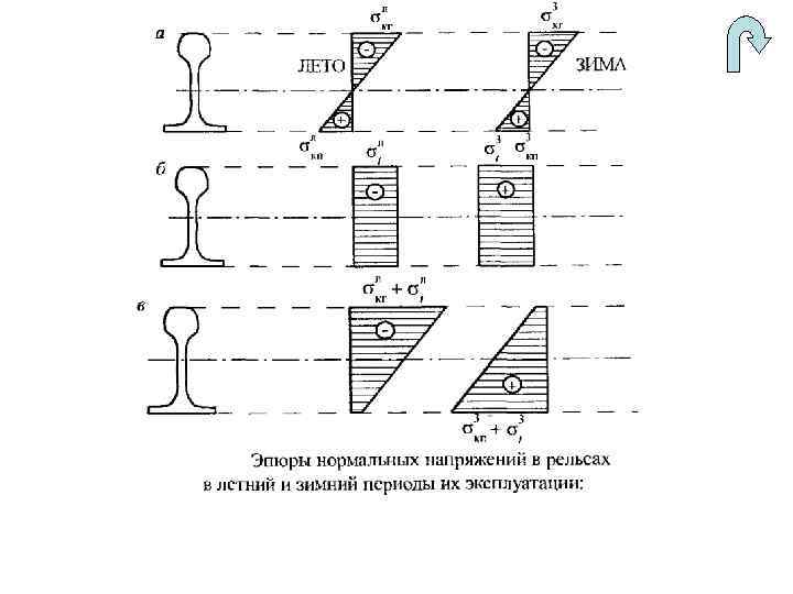 Расчет бесстыкового пути по условиям прочности Расчет прочности бесстыковой рельсовой плети основан на условии что наибольшие напряжения от воздействия на путь подвижного состава и изменений температуры рельсов не превышают допустимые значения: Напряжения в поперечном сечении рельса от действия сжимающих и растягивающих температурных сил, соответственно возникающих при понижении и повышении температуры рельса относительно нейтральной оси: