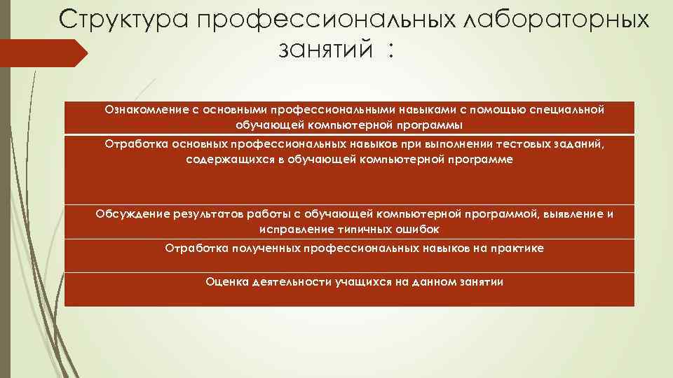 Структура профессиональных лабораторных занятий : Ознакомление с основными профессиональными навыками с помощью специальной обучающей компьютерной программы Отработка основных профессиональных навыков при выполнении тестовых заданий, содержащихся в обучающей компьютерной программе Обсуждение результатов работы с обучающей компьютерной программой, выявление и исправление типичных ошибок Отработка полученных профессиональных навыков на практике Оценка деятельности учащихся на данном занятии