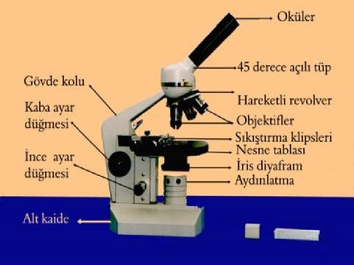 • MİKROSKOBUN BAKIMI: • Kullanıldıktan sonra yağ yumuşak bez veya gözlük camı kağıdı ile silinmelidir. Kurumuş sedir yağı ksilol, toluol veya benzole batırılarak yumuşatılmış bezle silinir.
