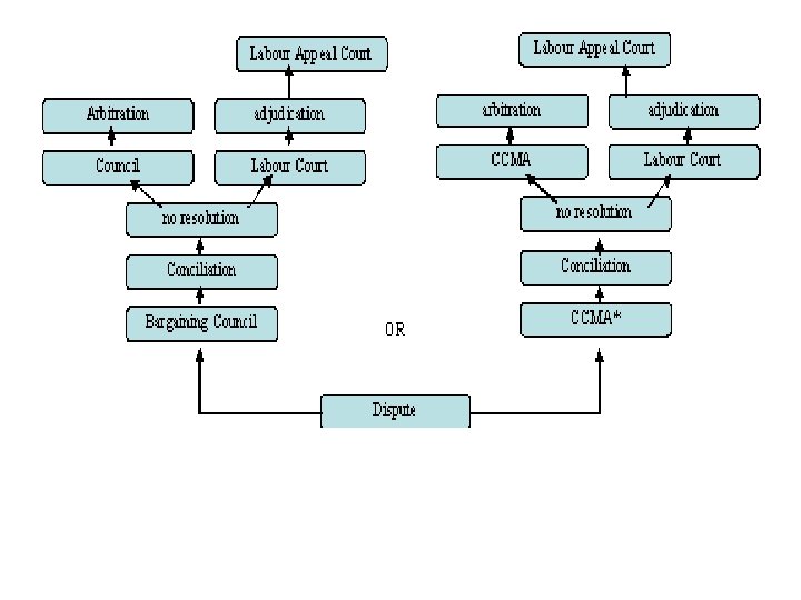 THEME 8 (LEARNING OUTCOMES) • • • Discuss the different structures for dispute resolution. Be acquainted with matters concerning the Commission for Conciliation, Mediation and Arbitration (CCMA). Be acquainted with matters pertaining to the accreditation and jurisdiction of, and subsidy to, councils and private agencies. Be acquainted with matters pertaining to the resolution of disputes under the auspices of the CCMA with reference to conciliations, arbitrations, con/arb, and pre-dismissal arbitrations. Be acquainted with matters pertaining to the Labour Court. Be acquainted with matters pertaining to the Labour Appeal Court. Be acquainted with matters pertaining to general provisions applicable to courts established by the Labour Relations Act. Explain the consequences of private dispute resolution. Discuss relevant case law.