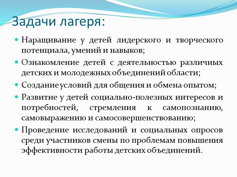 Задачи лагеря: Наращивание у детей лидерского и творческого потенциала, умений и навыков; Ознакомление детей с деятельностью различных детских и молодежных объединений области; Создание условий для общения и обмена опытом; Развитие у детей социально-полезных интересов и потребностей, стремления к самопознанию, самовыражению и самосовершенствованию; Проведение исследований и социальных опросов среди участников смены по проблемам повышения эффективности работы детских объединений.
