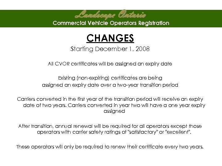 Landscape Ontario Commercial Vehicle Operators Registration CHANGES Starting December 1, 2008 All CVOR certificates will be assigned an expiry date Existing (non-expiring) certificates are being assigned an expiry date over a two-year transition period Carriers converted in the first year of the transition period will receive an expiry date of two years. Carriers converted in year two will have a one year expiry assigned After transition, annual renewal will be required for all operators except those operators with carrier safety ratings of "satisfactory" or "excellent". These operators will only be required to renew their certificate every two years.