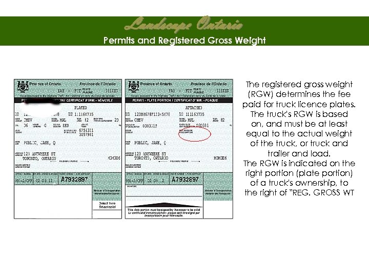 Landscape Ontario Permits and Registered Gross Weight The registered gross weight (RGW) determines the fee paid for truck licence plates. The truck's RGW is based on, and must be at least equal to the actual weight of the truck, or truck and trailer and load. The RGW is indicated on the right portion (plate portion) of a truck's ownership, to the right of "REG. GROSS WT