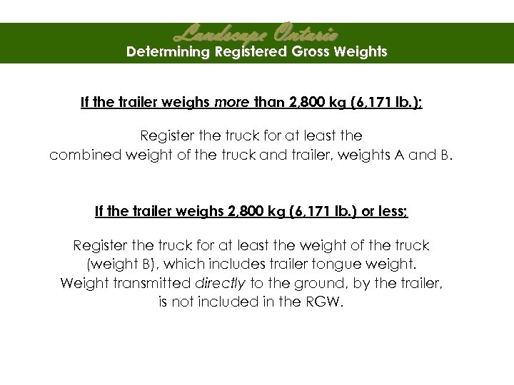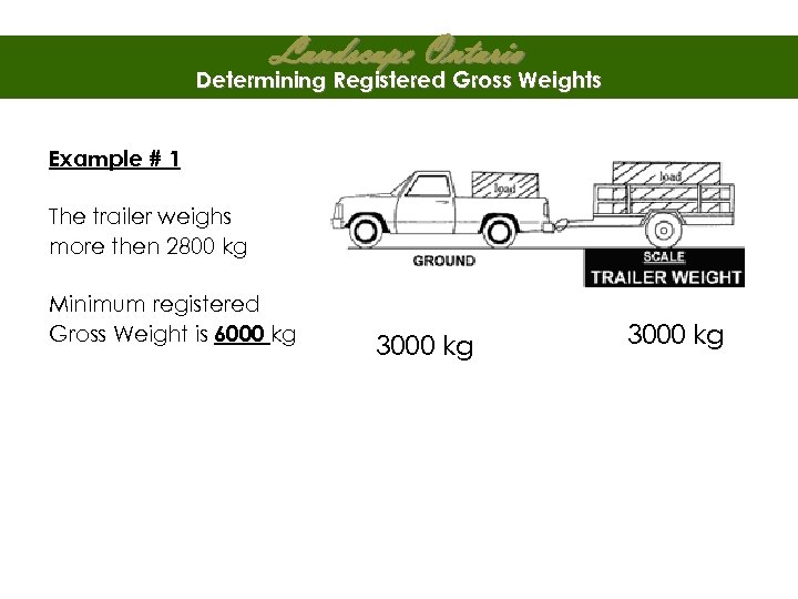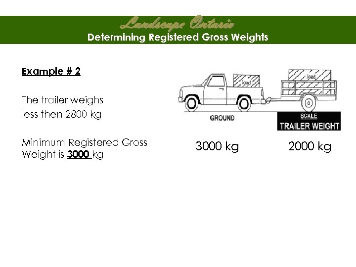 Landscape Ontario Determining Registered Gross Weights Example # 2 The trailer weighs less then 2800 kg Minimum Registered Gross Weight is 3000 kg 2000 kg