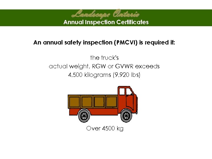 Landscape Ontario Annual Inspection Certificates An annual safety inspection (PMCVI) is required if: the truck's actual weight, RGW or GVWR exceeds 4, 500 kilograms (9, 920 lbs) Over 4500 kg