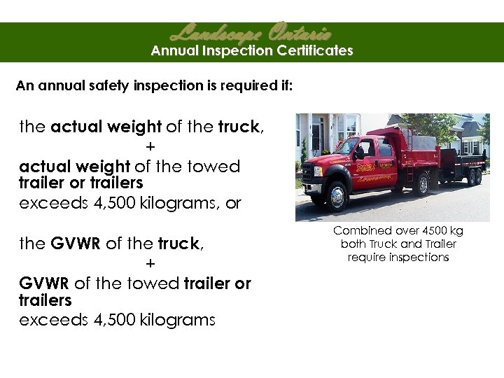 Landscape Ontario Annual Inspection Certificates An annual safety inspection is required if: the actual weight of the truck, + actual weight of the towed trailer or trailers exceeds 4, 500 kilograms, or the GVWR of the truck, + GVWR of the towed trailer or trailers exceeds 4, 500 kilograms Combined over 4500 kg both Truck and Trailer require inspections