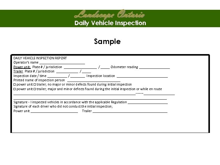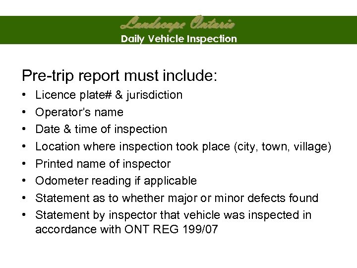Landscape Ontario Daily Vehicle Inspection Pre-trip report must include: • • Licence plate# & jurisdiction Operator’s name Date & time of inspection Location where inspection took place (city, town, village) Printed name of inspector Odometer reading if applicable Statement as to whether major or minor defects found Statement by inspector that vehicle was inspected in accordance with ONT REG 199/07