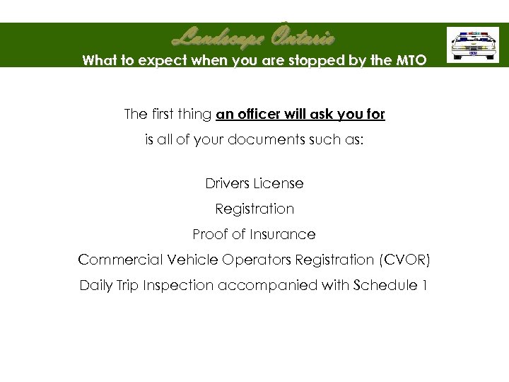 Landscape Ontario What to expect when you are stopped by the MTO The first thing an officer will ask you for is all of your documents such as: Drivers License Registration Proof of Insurance Commercial Vehicle Operators Registration (CVOR) Daily Trip Inspection accompanied with Schedule 1