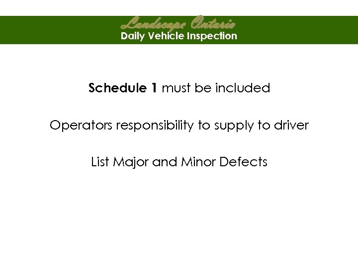 Landscape Ontario Daily Vehicle Inspection Schedule 1 must be included Operators responsibility to supply to driver List Major and Minor Defects