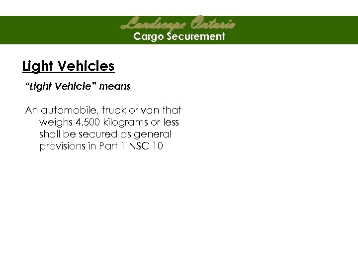 Landscape Ontario Cargo Securement Light Vehicles “Light Vehicle” means An automobile, truck or van that weighs 4, 500 kilograms or less shall be secured as general provisions in Part 1 NSC 10