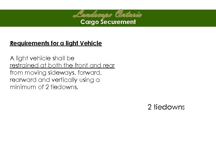 Landscape Ontario Cargo Securement Requirements for a light Vehicle A light vehicle shall be restrained at both the front and rear from moving sideways, forward, rearward and vertically using a minimum of 2 tiedowns