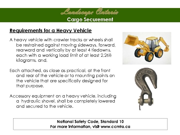 Landscape Ontario Cargo Securement Requirements for a Heavy Vehicle A heavy vehicle with crawler tracks or wheels shall be restrained against moving sideways, forward, rearward and vertically by at least 4 tiedowns, each with a working load limit of at least 2, 268 kilograms, and, Each attached, as close as practical, at the front and rear of the vehicle or to mounting points on the vehicle that are specifically designed for that purpose, Accessory equipment on a heavy vehicle, including a hydraulic shovel, shall be completely lowered and secured to the vehicle. National Safety Code, Standard 10 For more information, visit www. ccmta. ca