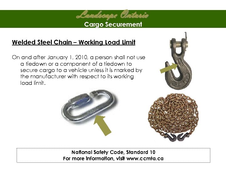 Landscape Ontario Cargo Securement Welded Steel Chain – Working Load Limit On and after January 1, 2010, a person shall not use a tiedown or a component of a tiedown to secure cargo to a vehicle unless it is marked by the manufacturer with respect to its working load limit. National Safety Code, Standard 10 For more information, visit www. ccmta. ca
