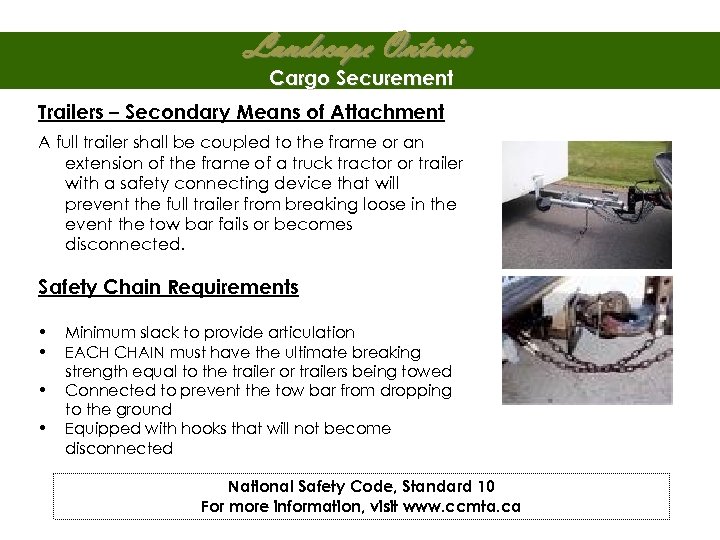 Landscape Ontario Cargo Securement Trailers – Secondary Means of Attachment A full trailer shall be coupled to the frame or an extension of the frame of a truck tractor or trailer with a safety connecting device that will prevent the full trailer from breaking loose in the event the tow bar fails or becomes disconnected. Safety Chain Requirements • • Minimum slack to provide articulation EACH CHAIN must have the ultimate breaking strength equal to the trailer or trailers being towed Connected to prevent the tow bar from dropping to the ground Equipped with hooks that will not become disconnected National Safety Code, Standard 10 For more information, visit www. ccmta. ca